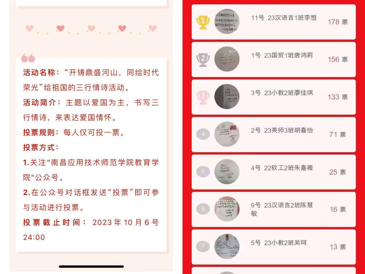 本次活动于线上展开,面向南昌应用技术师范学院全体学生,同学们便踊跃参与,短短的三行情诗皆是真意与真情的流露,凝结着中华儿女对祖国始终热忱的爱。
