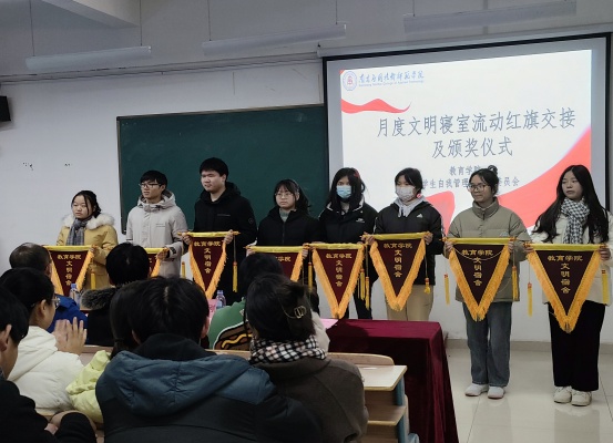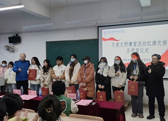月度文明寝室的评选增强了同学们的自律与安全防范意识相信在今后的生活学习中,同学们能够养成良好的生活习惯,携手共建安全卫生的宿舍环境。本次仪式中共选出10个12月“月度文明宿舍”,由11月文明寝室代表进行了流动红旗交接仪式,魏郁和万程刚为本学期文明宿舍代表颁发奖品。