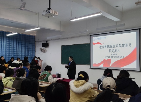 为展示优良学风建设月成果,促进我院学风建设的深入开展,鼓励广大学生勤奋学习、积极向上,保持优良的学风,教育学院于2023年12月20日在教学楼3308举办优良学风建设月表彰大会,总结优良学风建设成绩,表彰先进集体。出席本次仪式的有:教育学院党总支书记魏郁、副书记万程刚、后备干部杜静、学生管理科刘小灵、部分辅导员及学生代表。