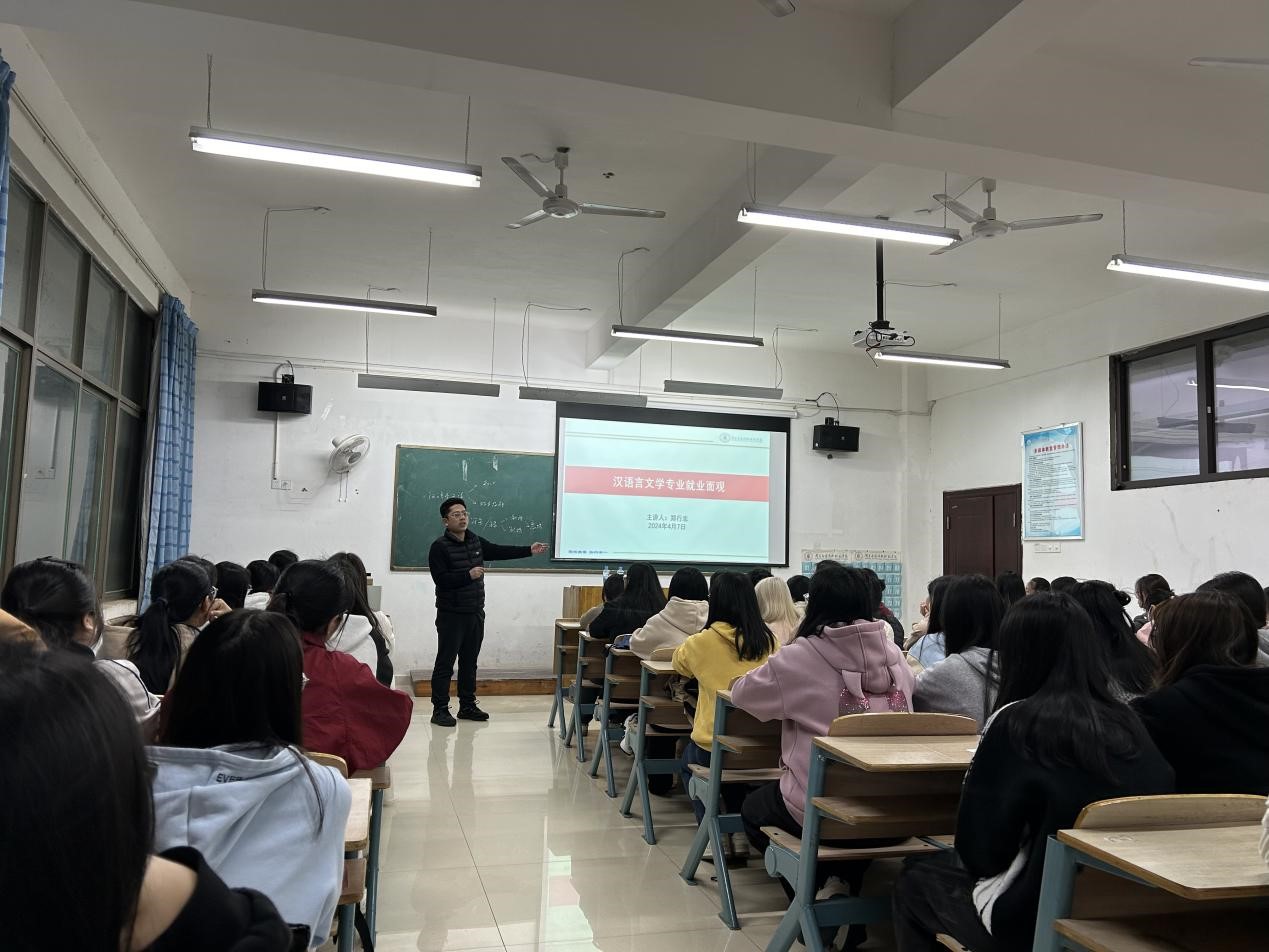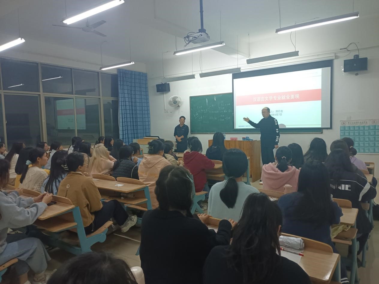 为贯彻落实“立德树人”理念,切实将就业育人、就业引导、就业服务纳入思政教育体系,推动课堂育人、活动育人相结合,共同构建学校就业育人体系,副校长郑行忠于4月7日晚19时在2104教室为21汉语言2班的同学讲授了一场别开生面的汉语言文学专业就业面观讲座。出席讲座的有学院党总支书记魏郁、学院就业专员刘泽按、辅导员武涛以及2021级汉语言2班全体学生。会议由学院党委书记魏郁主持。