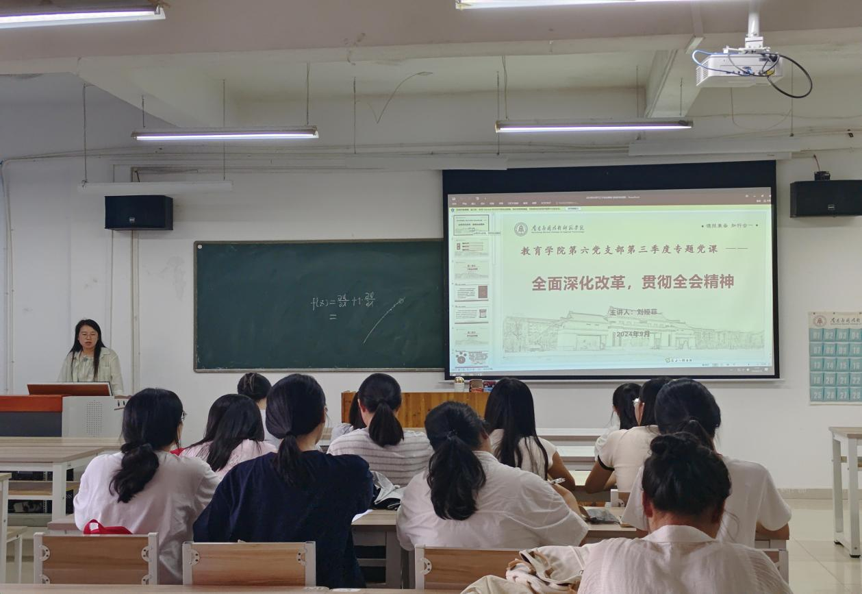 为了深入学习贯彻党的二十届三中全会精神,稳扎思想根蒂,坚定理想信念,推进全面深化改革,教育学院第六党支部于9月24日下午在1107教室开展了“全面深化改革,贯彻全会精神”的主题党课教育,由第六党支部书记刘娅菲进行宣讲,全体党员参加。