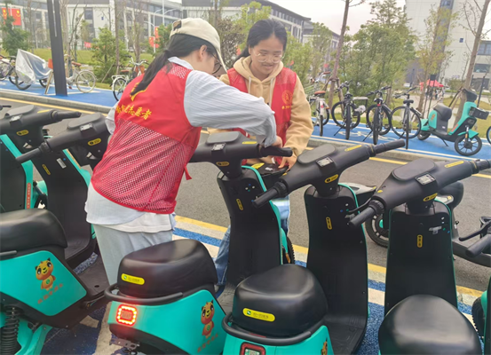 活动进程中,志愿者们分工清晰,各负其责,对随意停放的自行车及共享电动车进行有序整理,确保所有车辆均规范停放在指定区域。同时,志愿者们主动向过往学生普及文明停车的重要意义,倡导全校师生共同参与,携手维护校园环境的整洁与秩序。