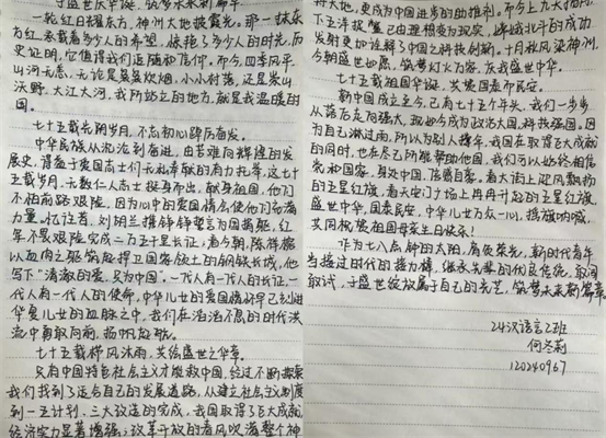 本次活动采用线上评选模式,不再拘泥于传统模式的线下评选,打破了时空限制,活动一经开展,便受到了同学们的热烈欢迎,同学们踊跃参加,纷纷亮出自己的作品。在展出的作品中,同学们笔下的文章化作了激昂的乐章,文字仿佛有力的鼓点,奏响了青春的奋进之歌,洋溢着青春的色彩,同时饱含对祖国的热爱,体现了同学们对伟大祖国的歌颂与赞叹。在历经七天的线上投稿后,老师及学生代表在文采、字迹、以及是否符合主题多方面对参赛作品进行了认真仔细的评选,最终九篇作品脱颖而出,荣获嘉奖。