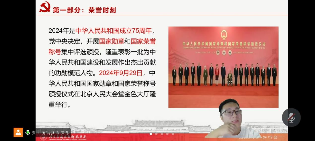 此次会议紧跟党的步伐,教育学院第五党支部书记朱广寿对9月29日上午在北京举行的“中华人民共和国国家勋章和国家荣誉称号颁奖仪式”同教育学院第五支部的各位党员进行学习交流。朱广寿勉励各党员将英雄精神内化于心,外化于行,并鼓励大家能向模范人物学习,砥砺前行,勇担历史重任,为谱写新时代中华人民共和国的壮丽篇章贡献力量。