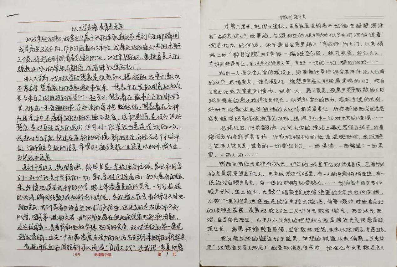 自活动开展以来便获热烈反响,采用撰文形式的同学从大学生活中的学业成长、社团活动、社交生活、职业规划等维度入手,并结合自身独特经历表达了感悟与思考,展现了新时代青年应有的责任与担当。采用绘画形式的同学或通过描绘教学楼、图书馆等建筑的自然图景展现对校园美景的赞赏,或通过描绘课堂学习、社团活动等日常人文场景来传递对校园生活的喜爱。同学们或用心中的文字或用手中的画笔描摹自己的真实所想,一纸一字都是对大学生活的期盼和向往,一笔一画都是对美好未来的想象与憧憬。每一份作品都是情感与思考的结晶,展现了同学们饱满的创作热情和昂扬的精神风貌,是新时代青年挺膺担当的生动体现。