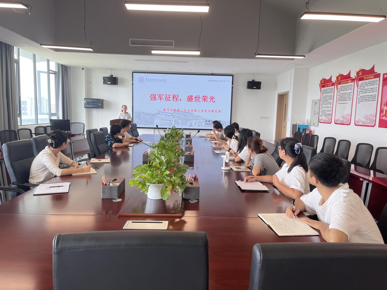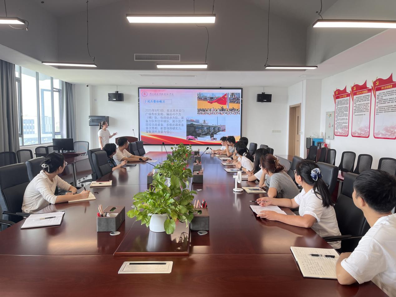 刘芮首先围绕“九三阅兵”的历史背景展开讲解。她指出,作为我国纪念抗战胜利的重要仪式,“九三阅兵”既是对历史的深切回望,彰显中国人民铭记历史、珍爱和平的坚定立场,更向世界宣示了中国维护国家主权与安全的坚强决心。她强调,强国必强军,强军方能安邦。新时代教育工作者要将阅兵精神融入立德树人全过程,引导青年学生树立强国之志,勇担时代使命。同时,她呼吁支部党员要以此次党课为思想坐标,把对家国的赤诚、对军队的敬意转化为教书育人的实际行动,在三尺讲台上传授知识、培育品格,让强军报国的种子在青年学子心中生根发芽。