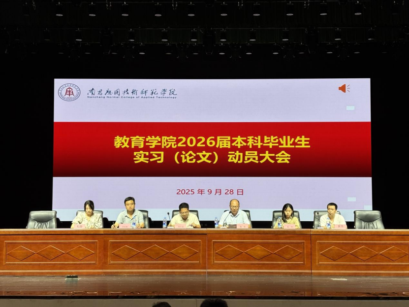 2025年9月28日,南昌应用技术师范学院教育学院在天工剧院召开2026届本科毕业生实习(论文)动员大会,出席本次大会有副校长兼教育学院院长郑行忠、教育学院副院长李亚楼、教育学院院长助理朱华、各专业系教研室主任、毕业班辅导员及全体毕业生。大会由教育学院党委书记魏郁主持。