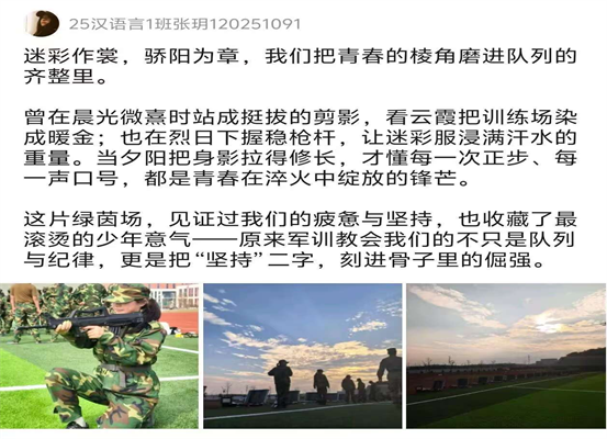 这些珍贵瞬间的定格,搭配着真挚的感悟文字,是军训在青春记忆里的鲜活注脚,呈现出军训生活的多样面貌,记录着同学们在军训中的蜕变与成长,展现了应师学子对军训岁月的深刻回味与成长思考。