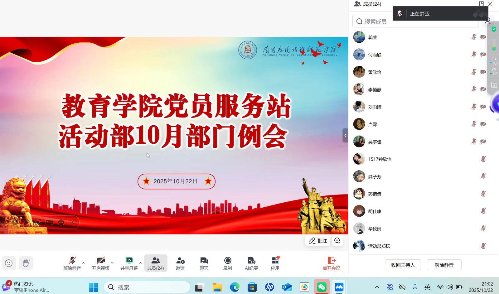 “凡事预则立,不预则废。”为梳理前期工作、规划后续任务,推动部门工作有序开展,教育学院党员服务站活动部于2025年10月22日召开10月线上工作例会,由朱敏、卢霖两位部长共同主持,部门全体成员参会。