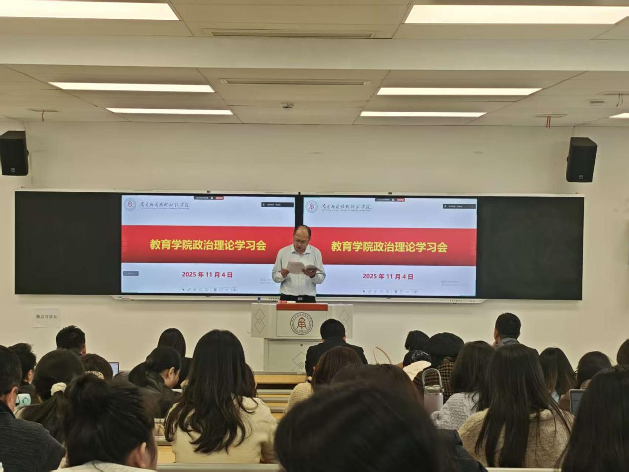 为深入学习贯彻党的二十届四中全会精神,切实把思想和行动统一到党中央决策部署上来,教育学院于2025年11月4日在沁苑二教B座309组织召开政治理论学习会,会议由学院党委书记魏郁主持,全体教职工参加。