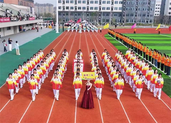 国旗彩旗引领之后,教育学院的鲜花方阵如一道流动的风景线:她们手捧缤纷花束,步伐矫健,笑靥自信。手臂挥动间,花朵在暖阳下划出流光;青春呐喊里,旋律在赛场中激昂回荡。而后,教育一队的“火炬方阵”手持象征希望的火炬,目光坚定、步伐铿锵。他们行至台前齐声高呼,那燃起的熊熊“火焰”,瞬间点燃全场,也庄严寓意着教育薪火的代代相传,彰显未来教师们点燃学子梦想的神圣使命。