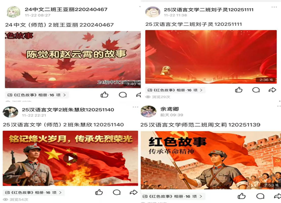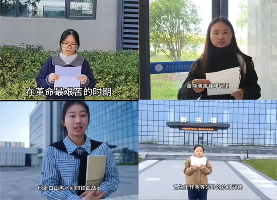 活动启动后,同学们积极化身“红色故事传承人”,围绕革命先烈事迹、时代榜样故事、家乡红色记忆等主题,精心打磨作品。有人以视频朗诵的形式,将邱少云烈火烧身时纹丝不动的坚毅瞬间娓娓道来,镜头里的声音因敬意而微微颤抖,却字字透着对“纪律重于生命”的震撼;有人对着镜头讲述儿童团员李爱民为掩护乡亲、冒死送情报的故事,清亮的语调里裹着对同龄小英雄的敬佩,把“少年亦有报国心”的纯粹讲得真切动人;还有人以视频朗诵还原赵一曼烈士的家书,伴着泛黄的信笺画面,将“未惜头颅新故国,甘将热血沃中华”的家国大义念得字字滚烫。这些视频作品里,或是眼含热泪却语气坚定的独白,或是画面与史料交织的沉浸式讲述,每一段声画都藏着青年对红色精神的共情与传承。
