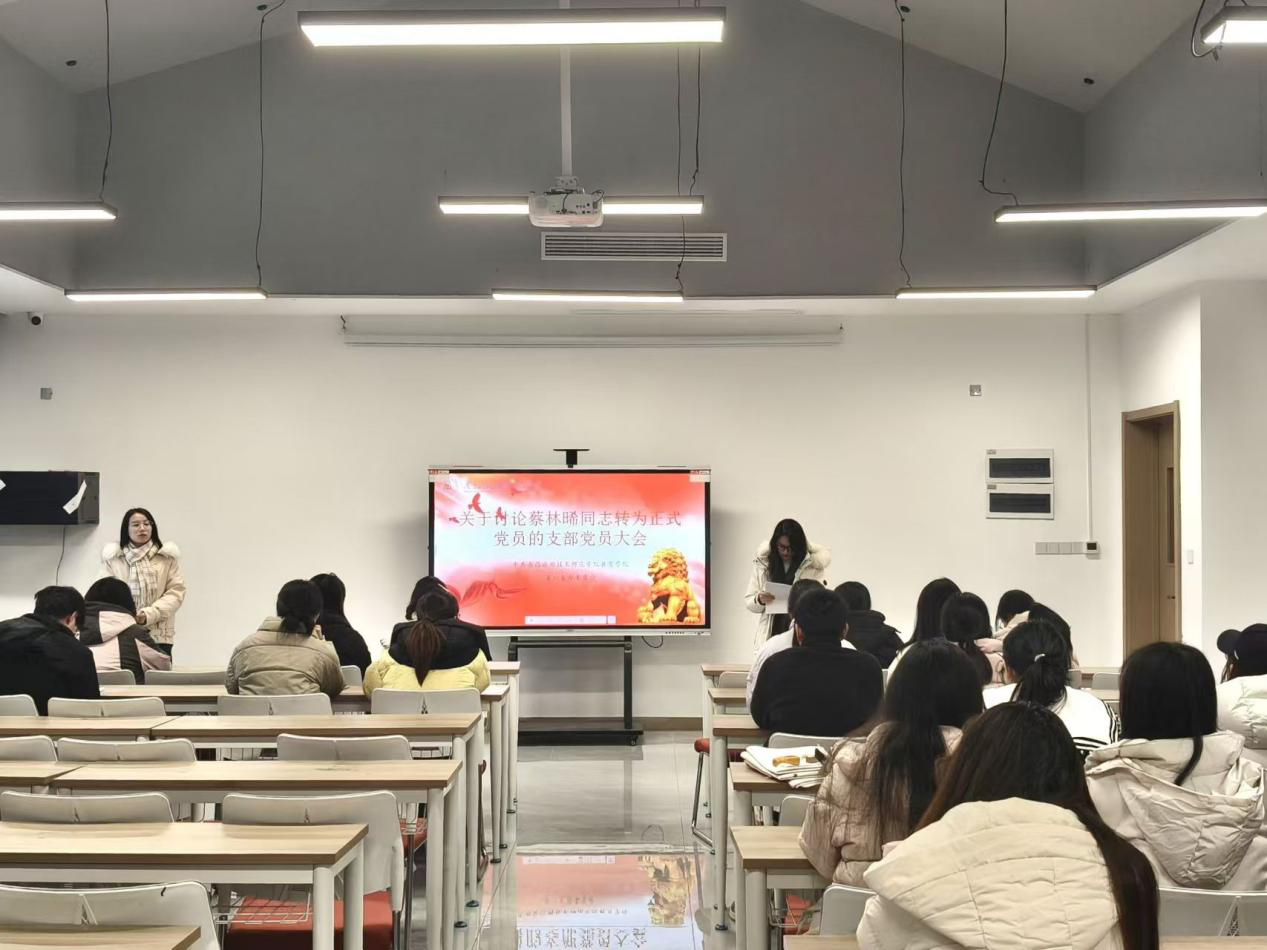 会议开始,蔡林晞同志上台郑重地向党组织汇报了自己预备期间的学习和生活情况,并再次坚定地表达了自己想加入中国共产党的强烈愿望以及需要向党组织说明的问题。接着,入党介绍人介绍了蔡林晞同志的主要情况,并就是否同意其按期转正逐一表明了意见。随后由组织委员朱静瑶同志代表支委会向支部大会报告对蔡林晞同志征求党员和群众意见情况。最后,在充分讨论与慎重思考后,全体党员以无记名投票方式,对蔡林晞同志进行表决。根据投票结果,全体一致同意接收蔡林晞同志为中共党员。