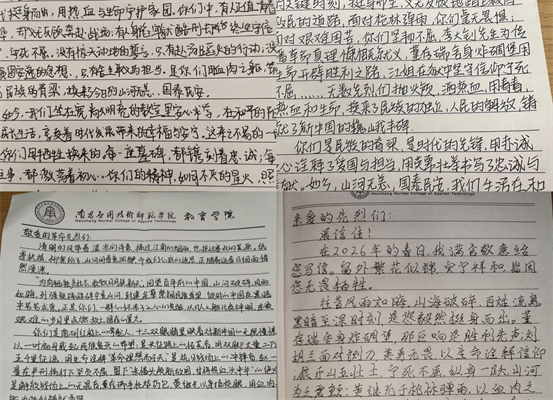 活动要求参与者紧扣清明时节与革命先烈事迹,撰写不少于500字的书信,并在信封封面注明姓名、学号及学院。同学们踊跃参与,纷纷以真挚的笔触表达对英烈的追思与崇敬。一封封手写书信或回顾峥嵘岁月,或抒发现代青年的使命担当,字里行间流露出“赓续精神血脉、勇担时代重任”的坚定信念。活动期间,同学们将完成的书信拍照上传至指定群相册,后续评优作品按活动要求线下提交至沁十509。